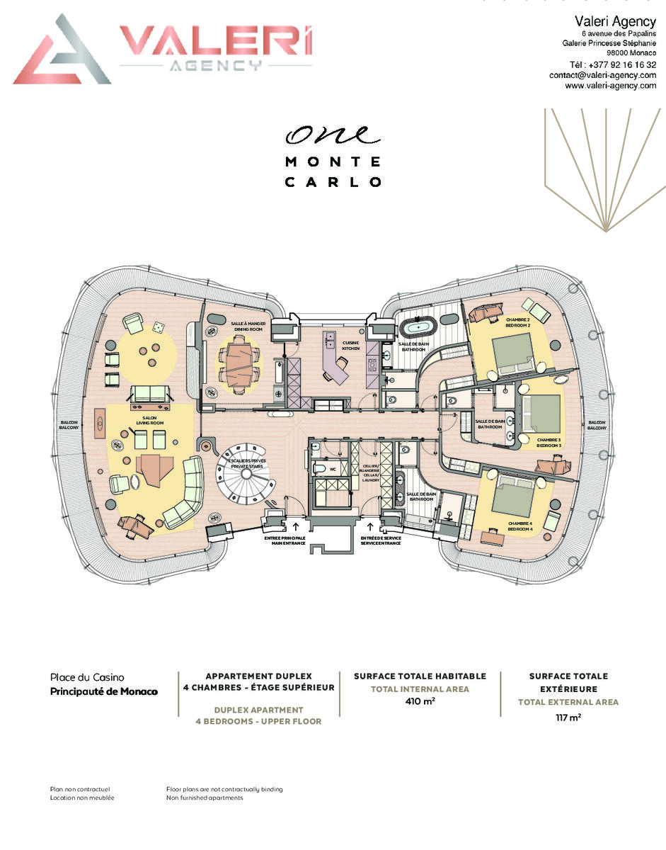 An exceptional place in the heart of the Golden Square of the Principality, which offers an exclusive 4-bedroom duplex apartment for rent consisting of :