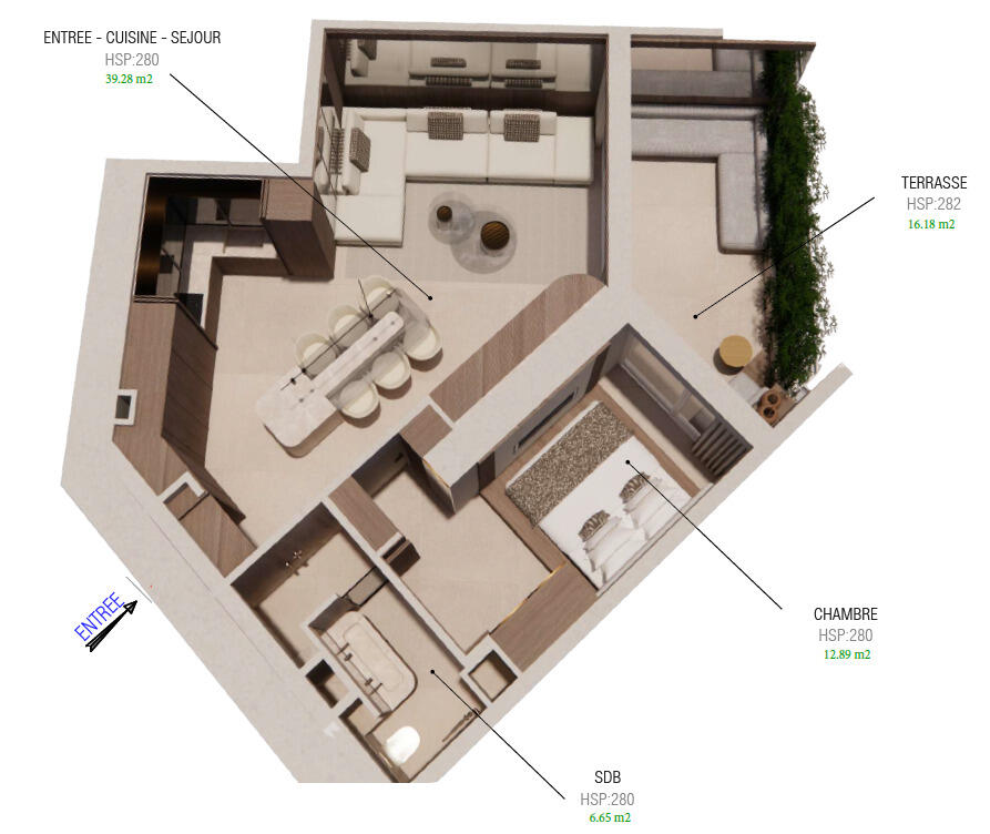 Il se compose d'une entrée, cuisine entièrement aménagée et équipée ouverte sur un confortable séjour / salle à manger, une chambre avec de nombreux rangements, une salle de bains avec douche et baignoire.