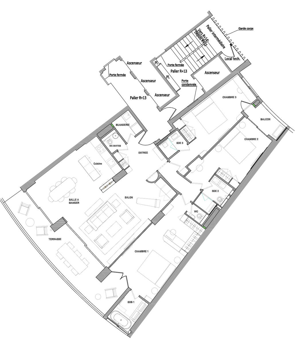 Si compone di un ingresso, di un ampio soggiorno con zona pranzo e cucina a vista con isola centrale. Tre camere da letto con bagno en suite, di cui una master bedroom con bagno completo, toilette separata e cabina armadio. Una delle altre due suite dispone di un bagno con doccia hammam. Una lavanderia e un bagno per gli ospiti sono discretamente integrati dietro porte a scomparsa nell’ingresso. Numerosi armadi e spazi contenitivi su misura completano la proprietà. Tutti gli ambienti hanno accesso a una terrazza, di cui una esposta a Sud/Ovest con vista aperta sulla città e sul mare. L’appartamento è completamente climatizzato e dotato di sistema domotico.